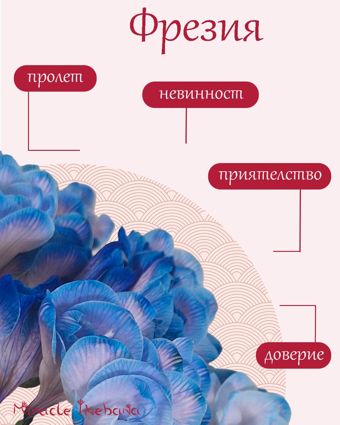 Фрезиите в икебана символизират пролет, невинност, доверие и искрено приятелство. Поради деликатния си аромат и нежни цветове, те често се използват за пресъздаване на младежка радост и положителна енергия. В японския език на цветята (hanakotoba) те понякога се свързват и с "детска наивност". Тази пролет ни носи именно такава енергия, изпълнена с носталгия, лекота, положителни мисли и наивитет на едно дете, чрез който да превъзмогваме лесно препятствията и трудностите и да продължаваме смело напред.