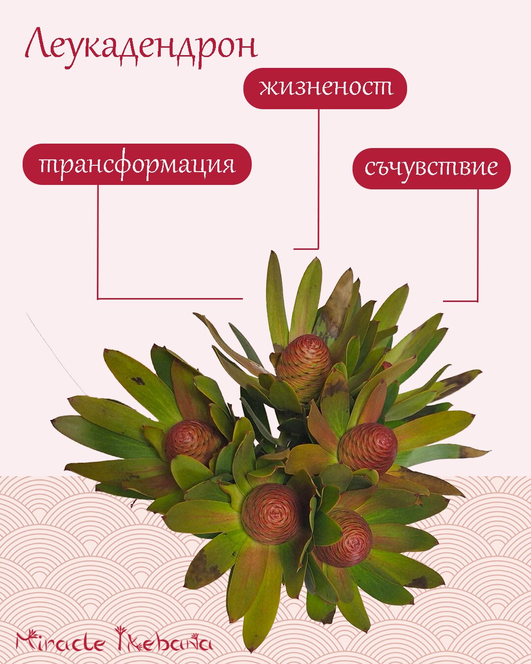 Леукадендрон има форма напомняща на шишарка, която се отваря, и затова това цвете се свързва с „отваряне на затворено сърце“. Отварянето на сърцето показва, че сме готови да приемем всичката любов и позитивна енергия, които заслужаваме, както и да ги споделяме с другите. Леукадендронът също така се свързва с трансформация, жизненост, уважение и съчувствие. Със своята необичайна форма и силно присъствие в цветните композиции, той символизира вътрешна сила и обновление. Това цвете ни напомня, че истинската красота често се крие в промяната и в смелостта да се отворим към света.