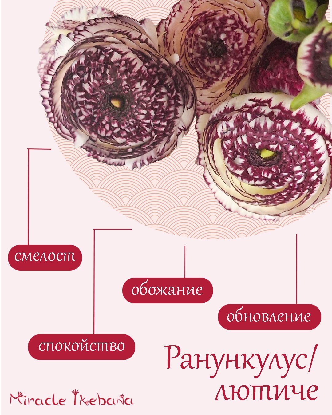 Лютичето/Ранункулус е символ на очарование, привлекателност, пролет и нова енергия. С това прекрасно цвете ви напомняме да се грижите и да отделяте време за себе си, тъй като то също символизира успокояваща точка - момента, в който спираме, дишаме, релаксираме и рефлектираме. За да се превърнем в най-добрата и сияйна версия на себе си първо е важно да вложим енергия и усилие в това да обичаме себе си.